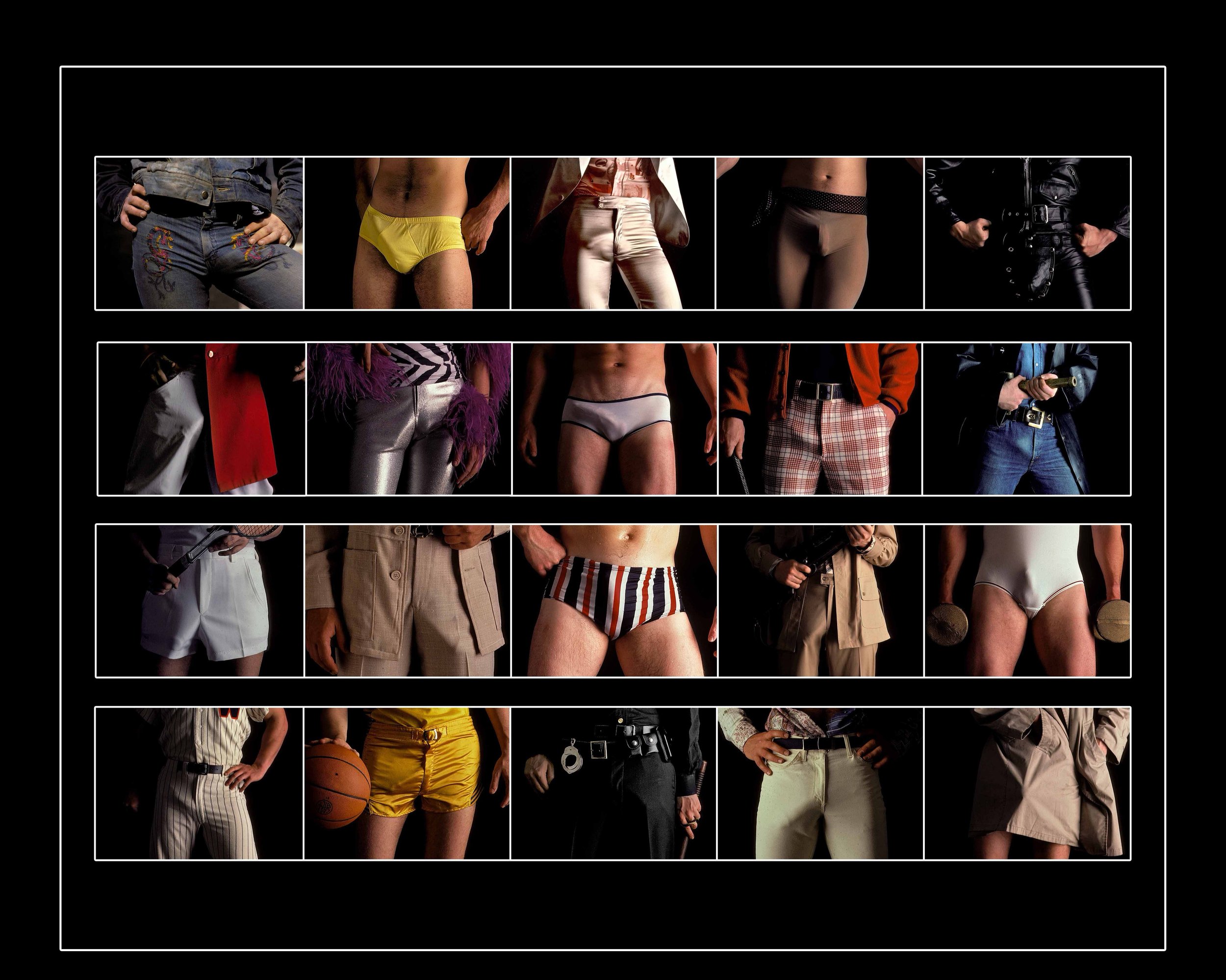 In Crotch Watching (1972) this lyrically erotic and tantalizing work by Robin Schwartz skillfully (and quite literally!) presents the peeling off of clothing as she combines a range of "exposures":drawing attention to the groin areas of her subjects in a range of light and shadow. Schwartz boldly features cropped midsections and genitalia of men, in a grid format. The genitalia is tightly garbed in a variety of ensembles, ranging from fitting swimwear, denim jeans, sports and police uniform, and leather. The body of work demonstrates some of Schwartz' influences, such as the iconic photographer Helmut Newton. Through this series, Schwartz presents a "peeling of time" by prefacing the revolutionary female gaze and states "these photographs represent an artistic and political time capsule of a unique moment in U.S. history. It was at the confluence of both the sexual revolution and the women's movement."